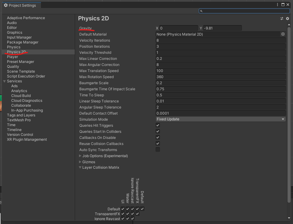 이러한 프로젝트 세팅에서 중력을 변경하는 방법은 게임 내의 모든 객체가 영향을 받기 때문에 일부 객체만 다른 중력 값을 받게 하기 위해서는 다음 방법을 사용해야 한다.