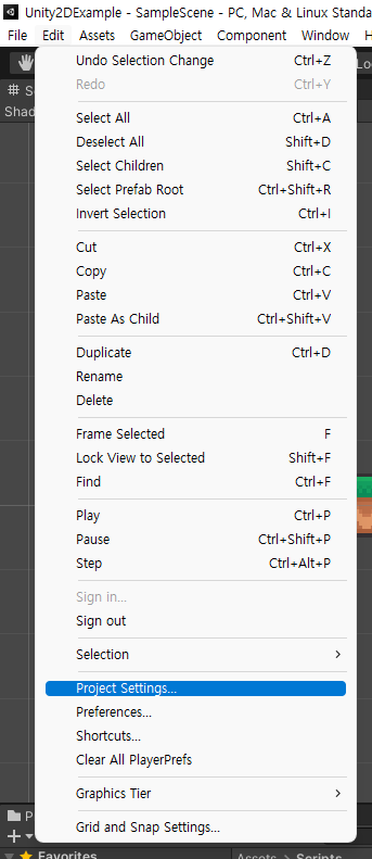 첫번째로 프로젝트 세팅에서 프로젝트 전체에 걸리는 중력을 조절하는 방법이다. [Edit] - [Project Settings]를 클릭하면 프로젝트 전체 세팅을 변경할 수 있는 창이 나타난다. 여기서 [Physics 2D]를 선택하면 Gravity가 있다. 기본적으로 Y 축 중력이 -9.81로 세팅되어 있는데 이를 더 작게 하면 객체에 걸리는 중력이 강해진다. 음수로 하면 아래로 중력이 가해지고 양수로 하면 위로 중력이 가해진다. 즉, 양수로 설정해놓으면 게임 시작 시 모든 객체가 위로 솟구친다.