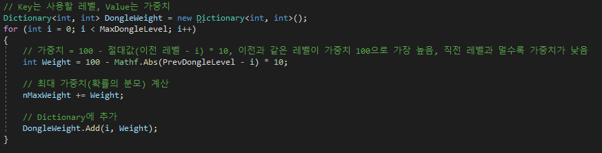 먼저 Dictionary를 사용하여 키와 밸류를 받는다. 이 때 Key는 레벨, value는 가중치가 된다.