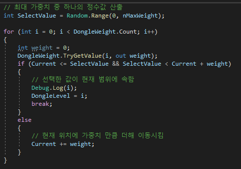 다음 0부터 최대 가중치 중 하나를 선택한다. 이 때 Random.Range 함수를 사용한다. Random.RandomRange 함수는 Deprecated 되었으므로 사용하지 않는다.