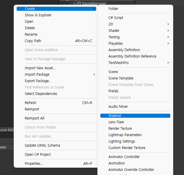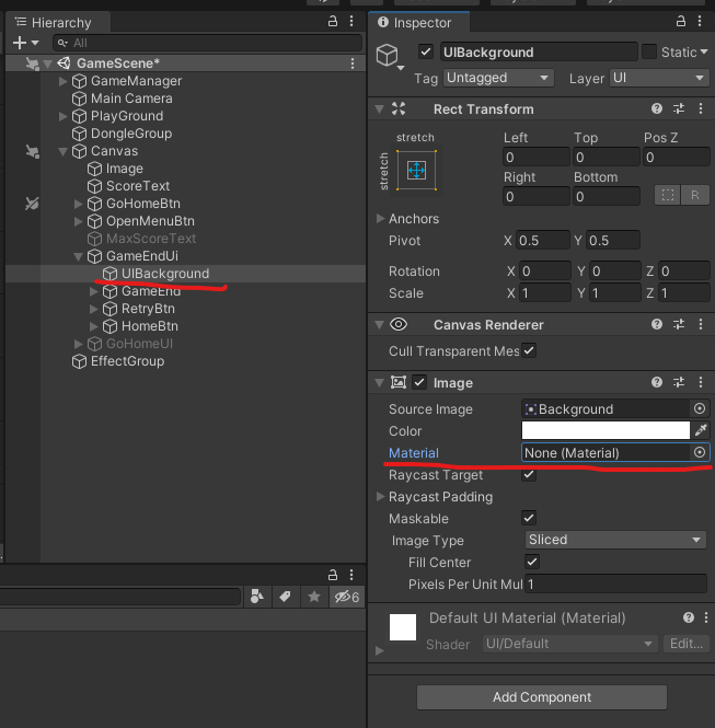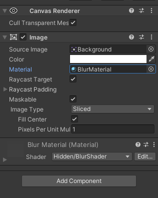 BlurShader를 적용하기 위한 Material을 추가한다. Material(재질)은 셰이더, 이미지, 컬러값 등 다양한 프로퍼티를 사용하여 객체, 이미지 등의 표면을 처리하기 위한 기능이다.