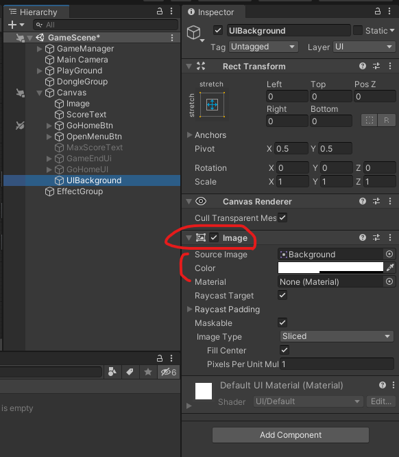 이제 아까 만들었던 Panel의 Image - Material에 드래그앤 드랍한다.