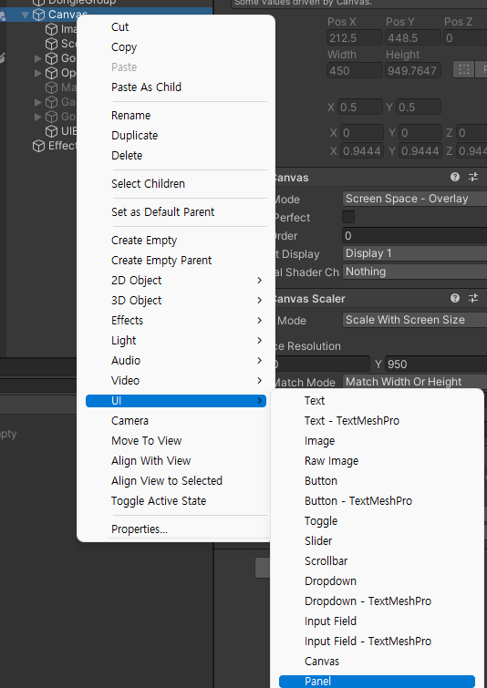 새롭게 추가한 Panel을 온오프할 UI의 아래에 추가한다. UI를 제작할 때 Panel을 가장 위에 두어도 된다.