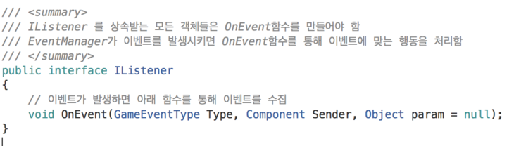 따라서 인터페이스를 이용하여 이벤트를 받을 객체들이 반드시 이벤트 받는 함수를 제작하도록 만든다