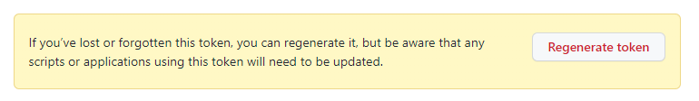 만약 퍼스널 토큰을 생성하고 복사하지 않고 종료하였다면 regenerate token 을 사용하여 토큰을 재생성한다.