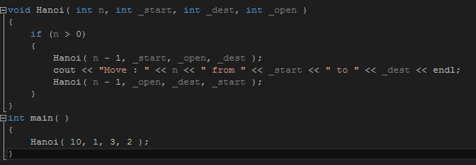 그리고 다시 n-1의 위치를 _dest로 옮겨야 하는데 n-1의 돌은 현재 _open 위치에 있다. 따라서 출발지점은 _open이 되며 목적지는 _dest이고 빈공간은 _start가 된다.( 함수 3번째 라인 )