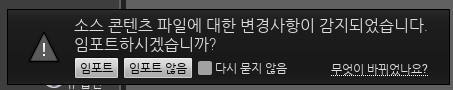 즉, 해당 폴더에 파일을 추가하면 언리얼이 자동으로 모니터링하여 임포트 할 것인지를 물어보는 것이다.