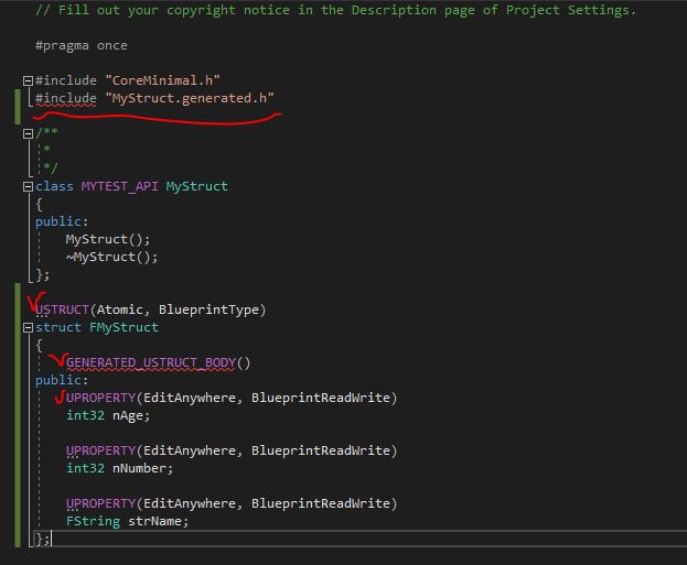 부모클래스가 없는 상태로 클래스를 생성했기 때문에 #include "MyStruct.generated.h" 를 선언한다. 이 선언은 #include 중 가장 아래에 있어야만 한다.