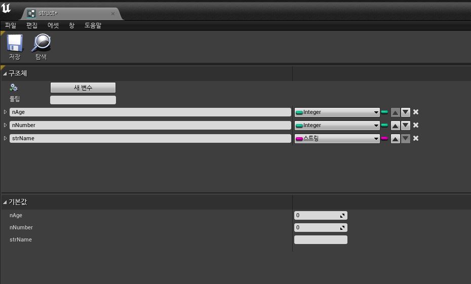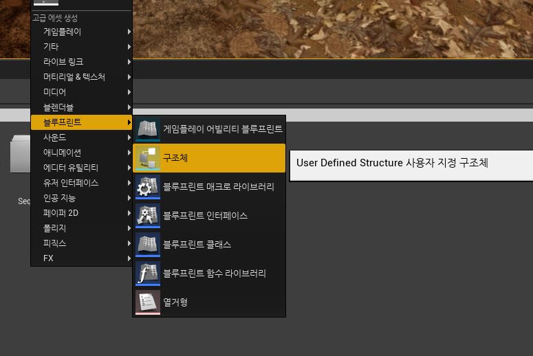 컨텐츠 브라우저에서 우클릭 - 블루프린트 - 구조체를 클릭하면 블루프린트 전용 구조체가 생성되며 만들어진 구조체를 더블클릭해 구조체 편집기에서 구조체를 구성할 수 있다.