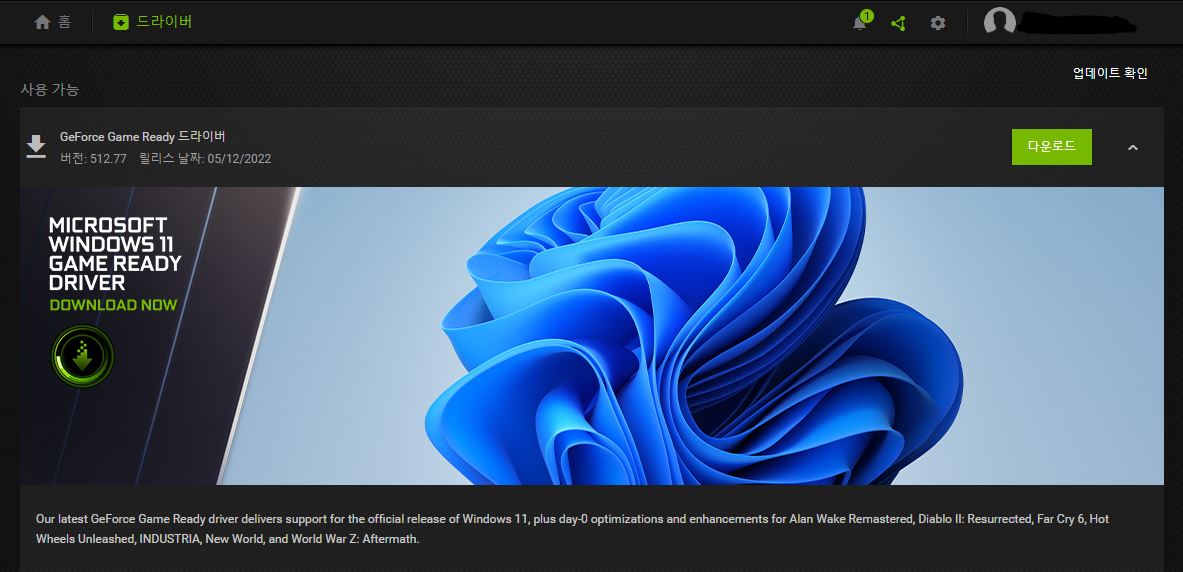 그렇지만 매번 이게 뜨게 놔둘 수 없는데다가 그래픽 드라이버 문제로 언리얼5가 언제 어떻게 강제종료될 지 모르기 때문에 최신버전을 설치해줍니다.
