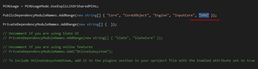 언리얼에서 제공하는 유저 인터페이스 기능인 UMG를 사용하기 위해서는 UMG 모듈을 추가해야한다.
