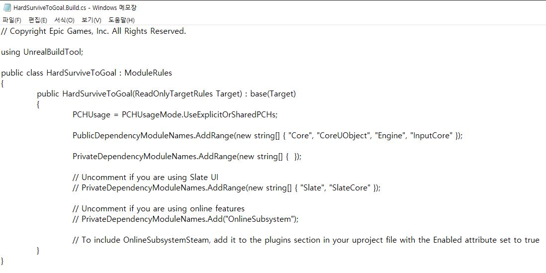 기본적으로 Core, CoreUObject, Engine, InputCore 만 엔진에 추가되어 있기 때문에 이외의 기능을 사용하기 위해서는 모듈을 추가해야 한다.