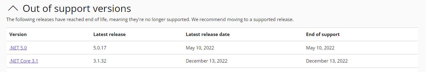 해당 창에서 > Out of support versions 를 클릭하면 이전 버전들이 나타나는데 이 곳에서 .NET Core 3.1 다운받을 수 있다.