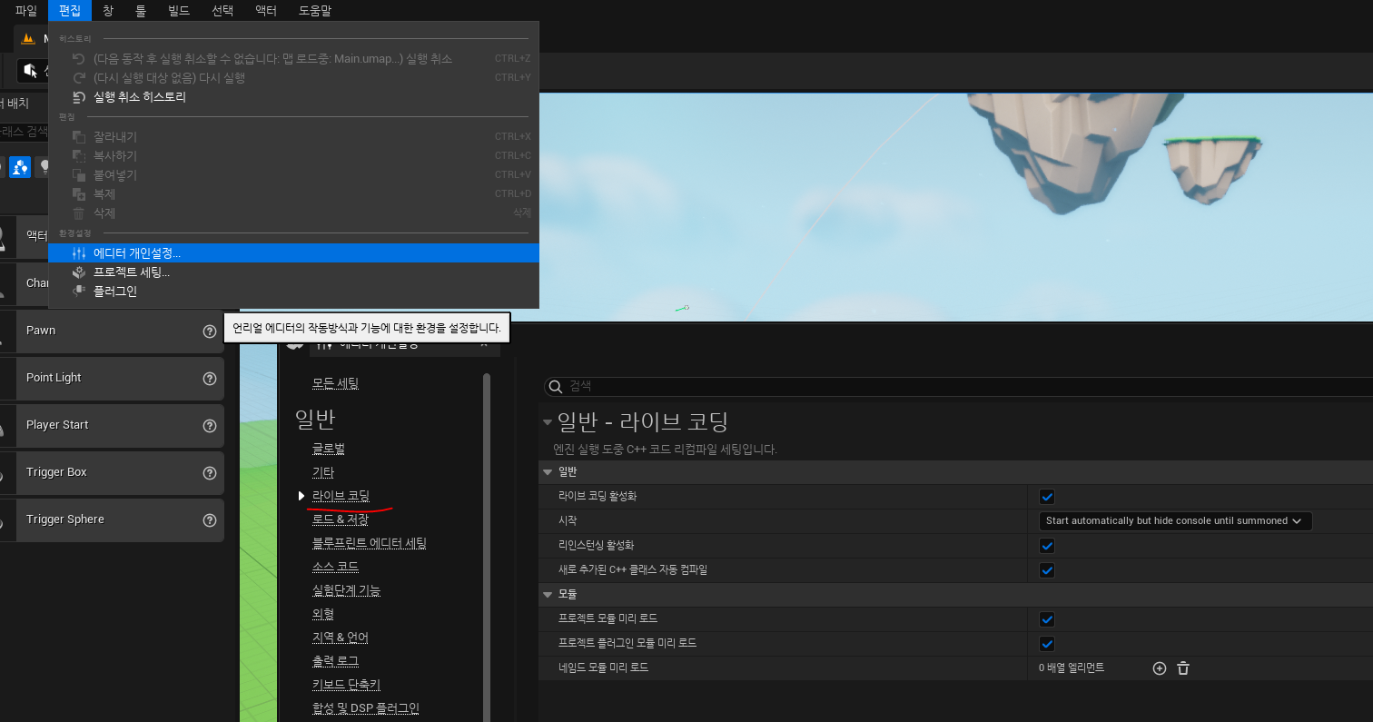 이밖에도 <편집 - 에디터 개인 설정 - 일반 - 라이브 코딩> 에서 비활성화 할 수 있습니다.