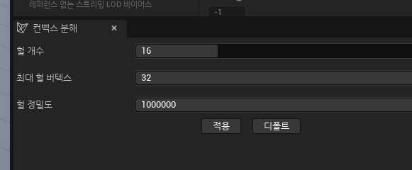 헐 갯수, 최대 헐 버텍스, 헐 정밀도를 높일수록 콜리전을 생성하는데 오랜 시간이 소요된다. 다만 높게 올리면 정확도는 늘어날 수 있지만 크게 의미가 없을 때도 있다. 콜리전이 복잡할수록 체크하는 오버헤드가 커지기 때문에 게임의 컨셉에 맞게 적절한 수준의 콜리전 생성이 중요하다.
