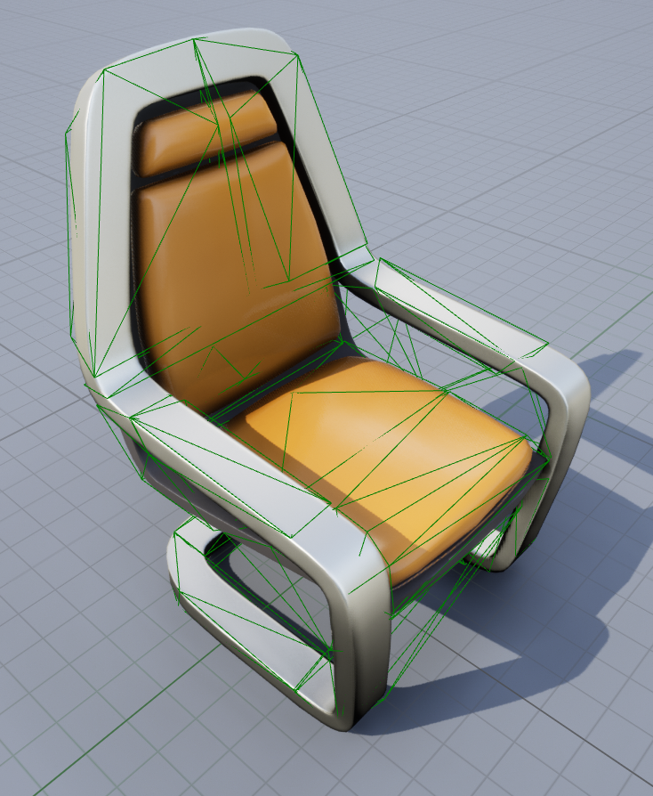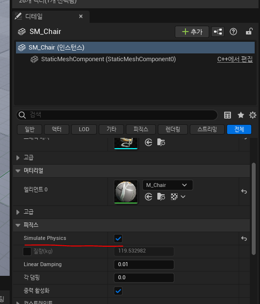 이렇게 배치된 스태틱 메시는 물리 시뮬레이션이 되지 않는다. 플레이어는 투사체를 발사하여 해당 오브젝트를 맞춰 물리에 의해 날아가는 것을 볼 것이기 때문에 물리 시뮬레이션이 가능하도록 변경한다. 해당 의자를 선택한 뒤 디테일 패널에서 [피직스] - [Simulate Physics]를 체크한다. 의자를 원하는 만큼 무겁게도 만들 수 있다. 무거울수록 움직이게 하기 위해서 더 큰 힘이 필요하다.