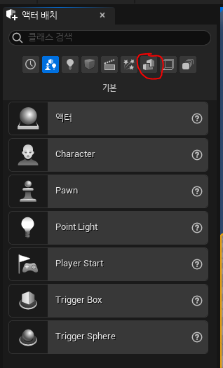 언리얼 좌측에 액터를 추가할 수 있는 액터 패치 패널이 있다. 기본으로 설정되어 있을텐데 지오메트리 버튼(오른쪽 3번째)을 클릭하여 변경한다. 박스를 선택한 다음 에디터 뷰포트에 그래그 앤 드랍하여 배치한다.