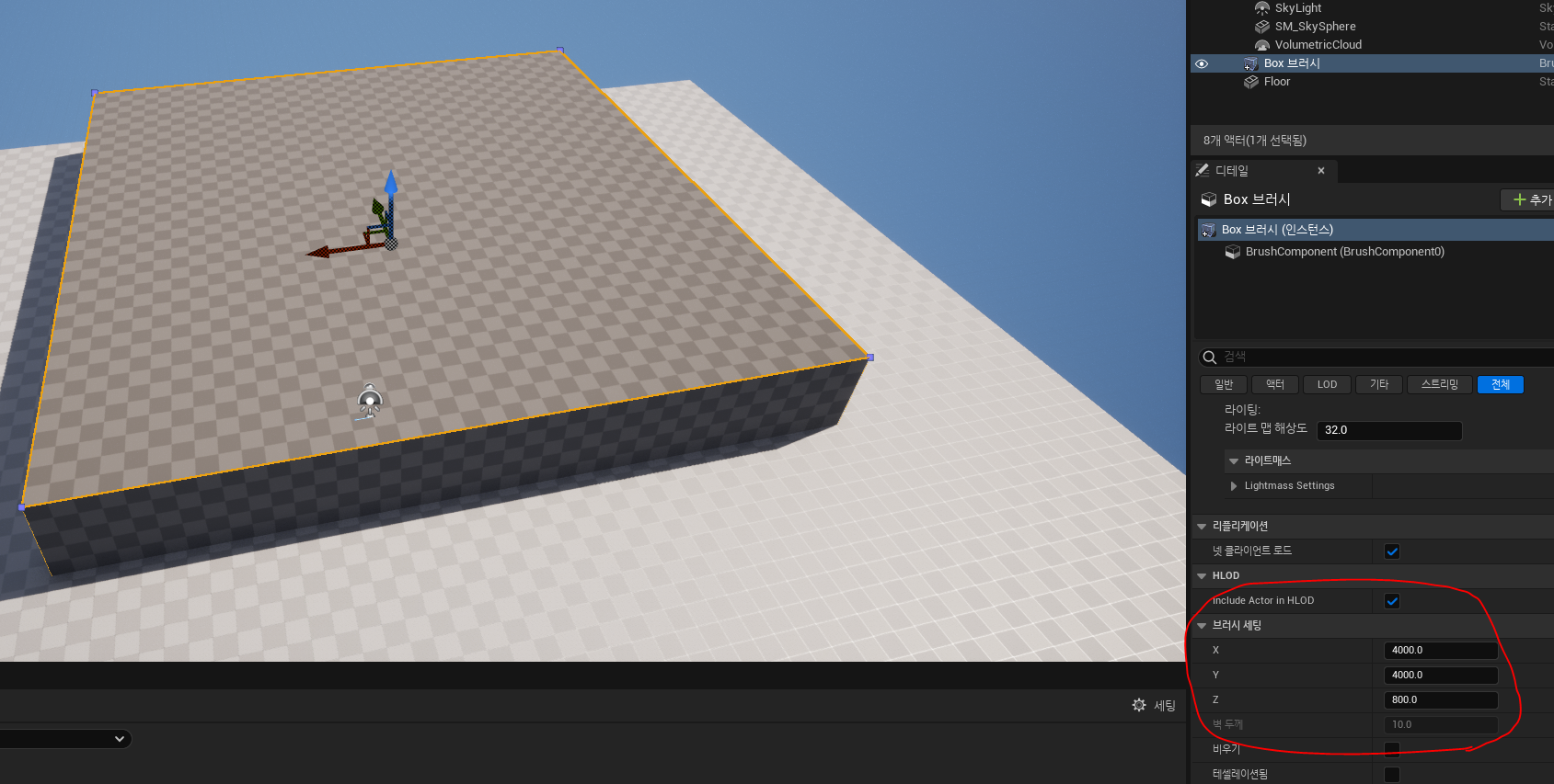 배치하고 나면 작은 정사각형 박스가 생성되는데 오른쪽에 있는 디테일 패널에서 [브러시 세팅] - [X] 를 변경하여 원하는 크기로 맞춘다. Y와 Z도 동일하게 변경한다. (4000, 4000, 800 으로 세팅했다.)
