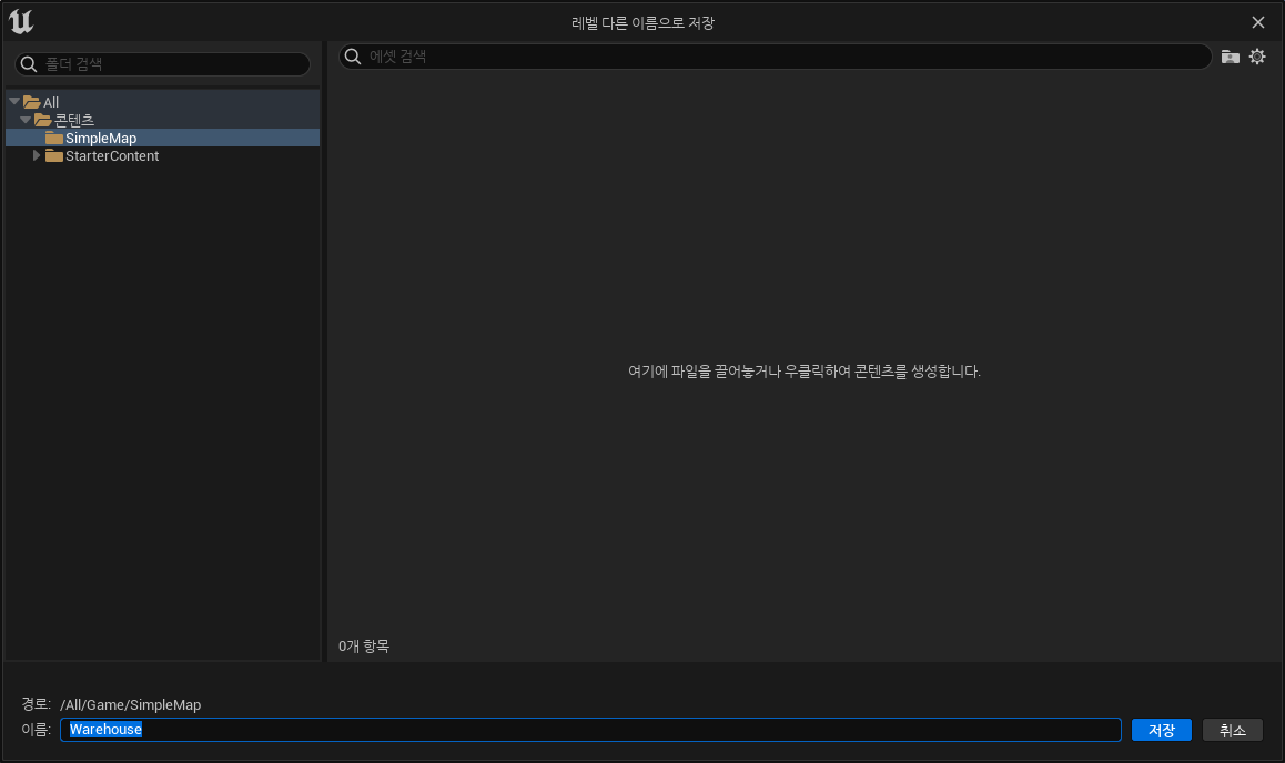 실행이 완료되면 위와 같은 화면이 나타난다. 스타트 콘텐츠를 포함하였기 때문인데, 이렇게 큰 빈 공간은 필요없으므로 새로운 맵을 만든다. 좌측 상단의 [파일] - [새 레벨] 을 클릭하고 베이직을 선택하고 생성한다.