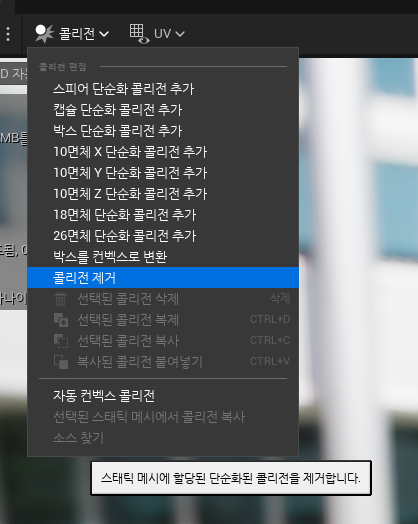 좌측 상단의 [콜리전] - [콜리전 제거] 를 클릭하여 단순 콜리전을 제거한다.
