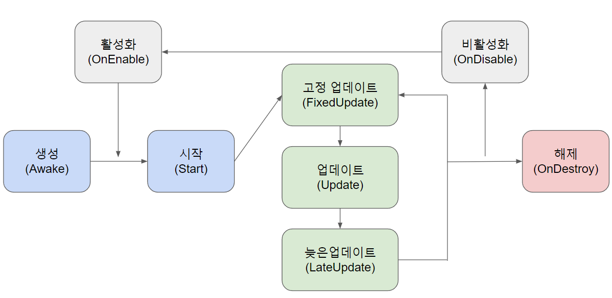 게임 오브젝트의 생명주기는 기본적으로 "탄생 -> 활성화 -> 시작 -> 고정 업데이트 -> 업데이트 -> 늦은 업데이트 -> 비활성화 -> 파괴" 순으로 순환한다. 또한 각 오브젝트는 자신의 현재 상태에 맞춰 특정 함수가 동작된다.