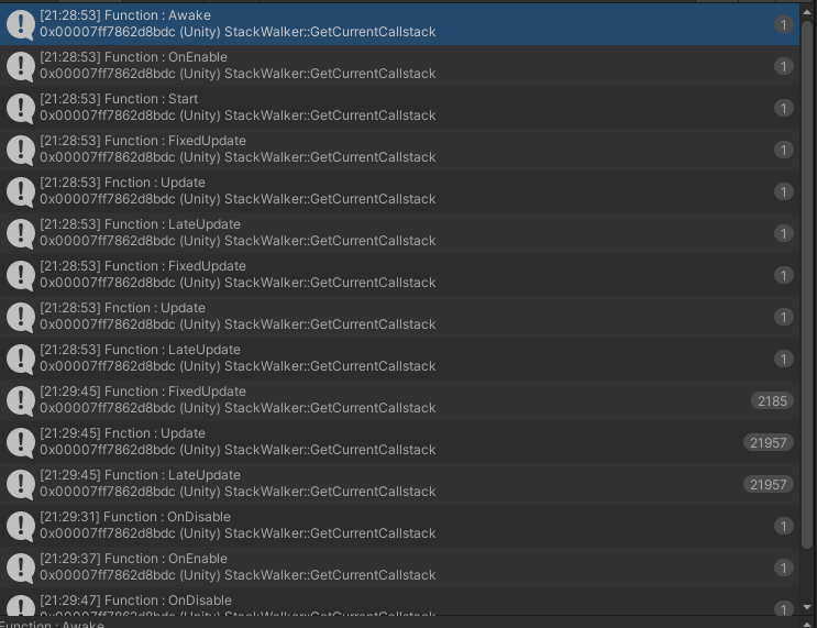 FixedUpdate는 고정된 프레임, Update, LateUpdate는 가변 프레임에 동작하기 때문에 FixedUpdate와 나머지 Update의 호출 횟수 차이가 극명하다. 이는 성능이 좋은 컴퓨터일수록 더 심하다.