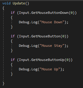 - GetMouseButtonDown : 마우스 입력이 들어왔을 때 True를 반환