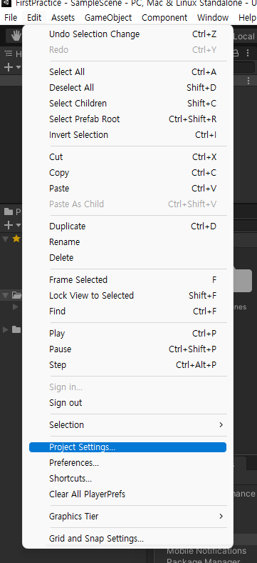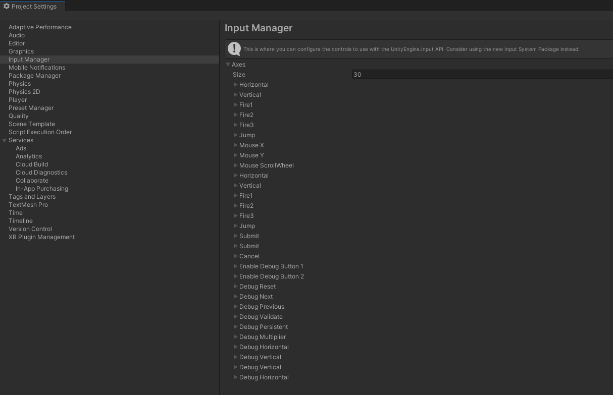 유니티 상단에 있는 [Edit] - [Project Settings] 를 클릭하면 프로젝트 설정 창이 나타난다. 여기서 [Input Manager]를 클릭하면 Axis가 존재하는데 프로젝트를 생성하면 유니티가 자주 사용하는 키를 이미 매핑해놓았다.