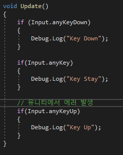 만약 아무 키나 누르고 있는 상태를 체크하고 싶다면 Input.anyKey가 True인지 체크하면 된다. Input.anyKey가 True라면 현재 어떤 입력을 하고 있는 중이라는 뜻이다. 그런데 현재 사용하고 있는 버전인 유니티 2020에서는 Input.anyKeyUp이 존재하지 않는다. 따라서 어떠한 키가 입력 해제되었는지 체크하기 위해서는 별도의 함수를 만들어야 한다.