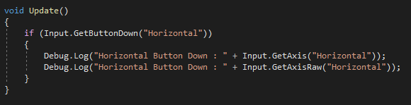 이제 매핑된 키의 이름을 사용하여 키 입력을 받아보자. Horizontal로 명명된 횡(좌우) 버튼은 키보드 왼쪽, 오른쪽과 a, d이다. 이 4개의 키가 눌렸을 때 처리를 위해서 GetButton, GetButtonDown, GetButtonUp 과 GetAxis 또는 GetAxisRaw 함수를 사용한다.