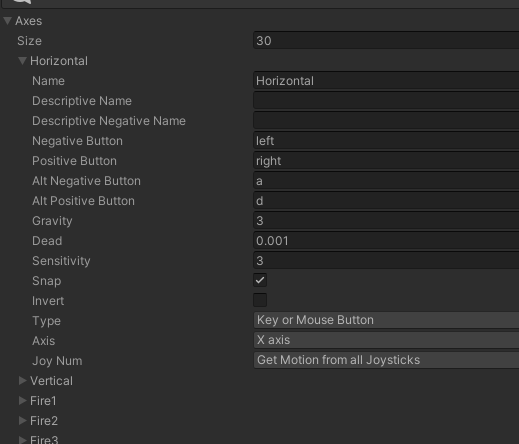 Negative Button은 음수값이 들어올 키, Positive Button은 양수값이 들어올 키를 세팅한다. 앞에 Alt 가 있는 것은 대체 키로 기본적인 Negative Button과 Positive Button을 누를 수 없을 때 백업으로 눌릴 키를 세팅한다.