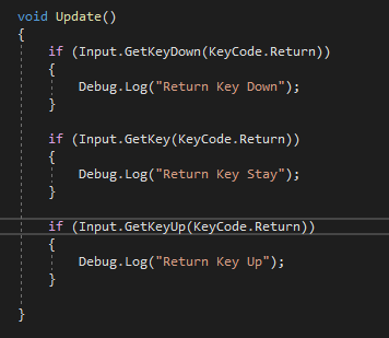 유니티에서는 Input 클래스를 통해 입력을 받을 수 있다. Input은 유니티가 제공하는 입력을 총괄하는 클래스이다. 입력은 크게 3가지 상태로 처리되는데 Down, Stay, Up 이다. Down은 눌렀을 때, Stay는 눌리고 있는 중일 때, Up은 뗐을 때를 의미한다.