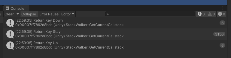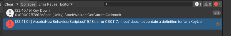 만약 아무 키나 누르고 있는 상태를 체크하고 싶다면 Input.anyKey가 True인지 체크하면 된다. Input.anyKey가 True라면 현재 어떤 입력을 하고 있는 중이라는 뜻이다. 그런데 현재 사용하고 있는 버전인 유니티 2020에서는 Input.anyKeyUp이 존재하지 않는다. 따라서 어떠한 키가 입력 해제되었는지 체크하기 위해서는 별도의 함수를 만들어야 한다.